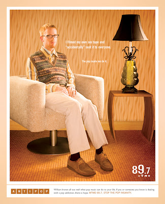 These ads have been around for a few years, and although the richness of the color always draws my eye, I've never really understood the concept. I always assumed there was just something I didn't understand about it, but now I'm pretty sure it simply doesn't make much sense. I get that it's supposed to mirror the "My Anti-Drug" PSAs ... but I don't follow the vintage/retro scene-setting. The images aren't pop, nor do they really represent WTMD's voice or audience (anti-pop). The copy works, but to me, the visual theme creates some conflict.